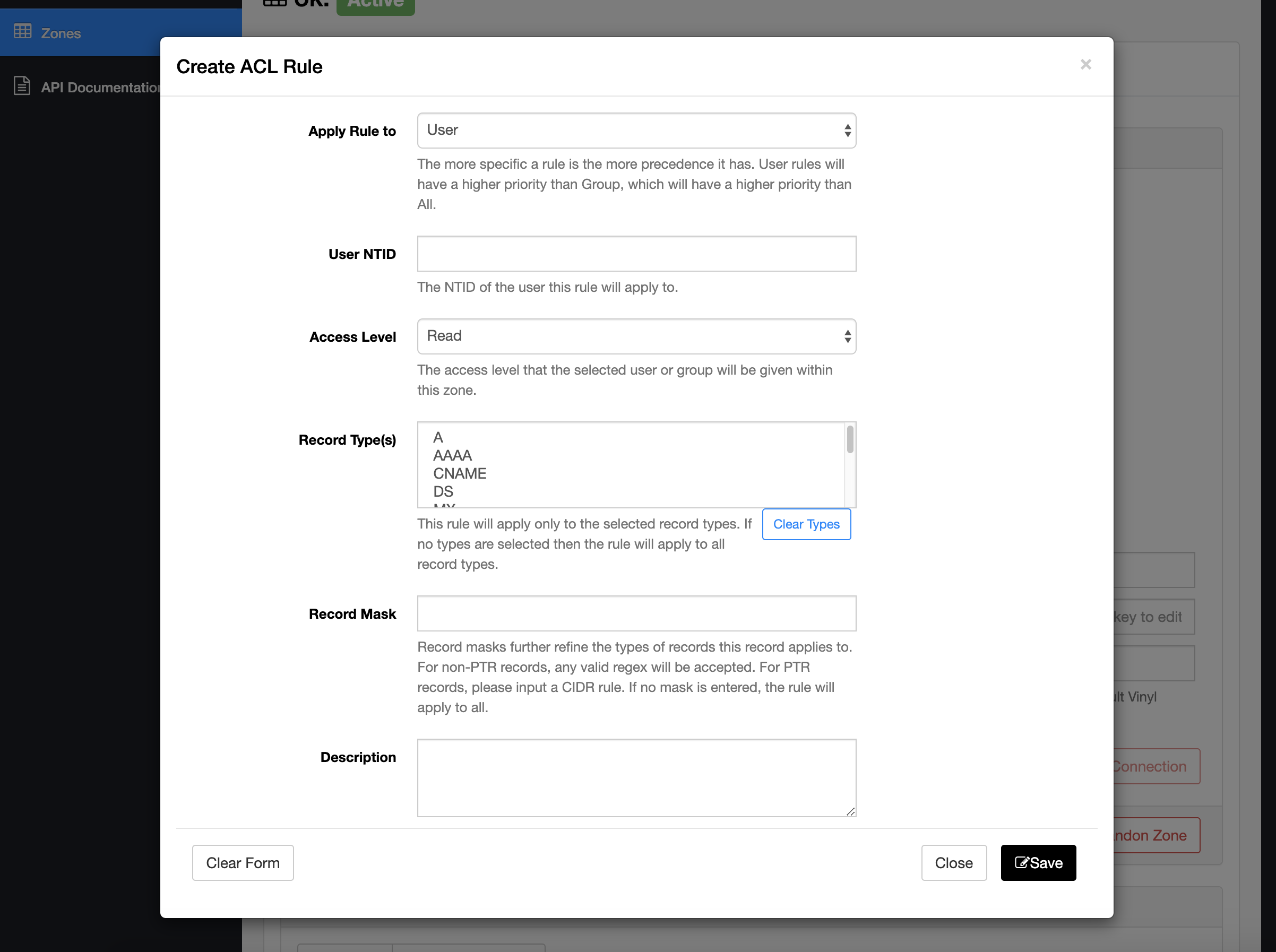 If you don’t want a user to have full access to a zone you can use ACL rules to give them more granular access. With ACL rules, the zone admins can grant individual users or groups read, write or delete access to all records in the zone, or a subset of record names and/or types.